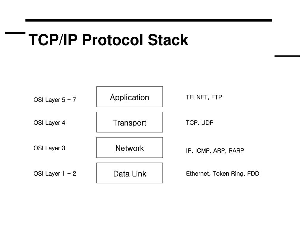 TCP/IP Protocol Stack Application TELNET, FTP OSI Layer 5 - 7 Transport OSI Layer 4 TCP, UDP Network OSI Layer 3 IP, ICMP, ARP, RARP Data Link OSI Layer 1 - 2 Ethernet, Token Ring, FDDI
