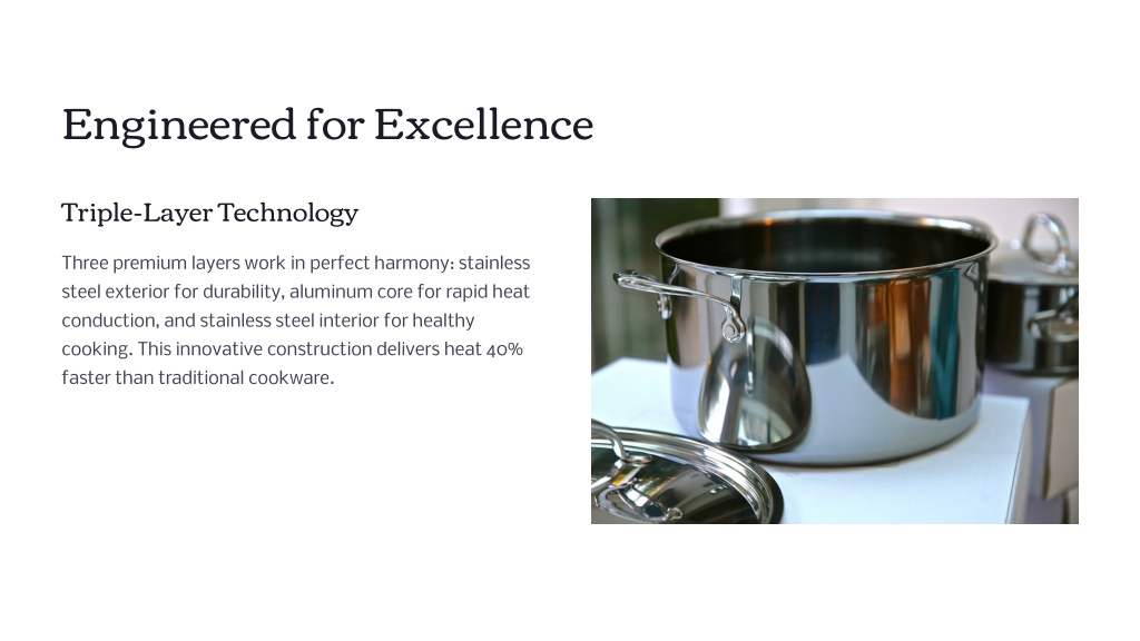 2. Engineered for Excellence Triple-Layer Technology Three premium layers work in perfect harmony: stainless steel exterior for durability, aluminum core for rapid heat conduction, and stainless steel interior for healthy cooking. This innovative construction delivers heat 40% faster than traditional cookware.