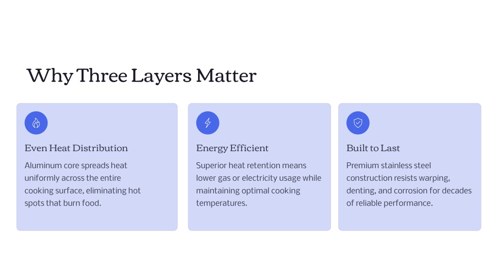 3. Why Three Layers Matter Even Heat Distribution Energy Efficient Built to Last Aluminum core spreads heat uniformly across the entire cooking surface, eliminating hot spots that burn food. Superior heat retention means lower gas or electricity usage while maintaining optimal cooking temperatures. Premium stainless steel construction resists warping, denting, and corrosion for decades of reliable performance.