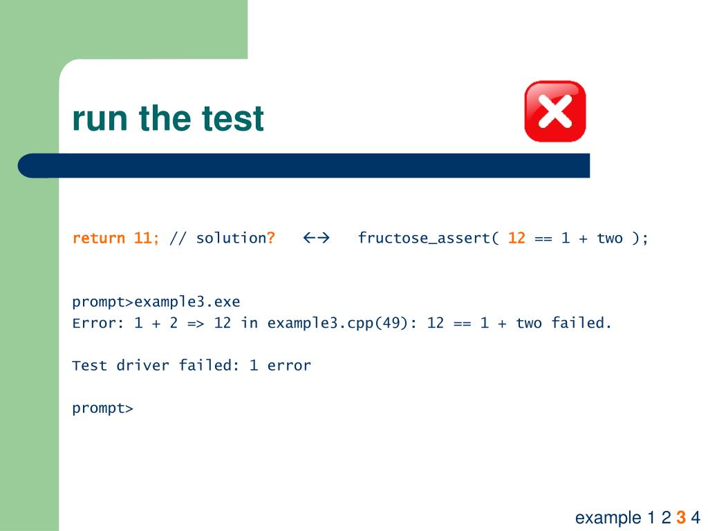 run the test return 11; // solution? fructose_assert( 12 == 1 + two ); prompt>example3.exe Error: 1 + 2 => 12 in example3.cpp(49): 12 == 1 + two failed. Test driver failed: 1 error prompt> example 1 2 3 4