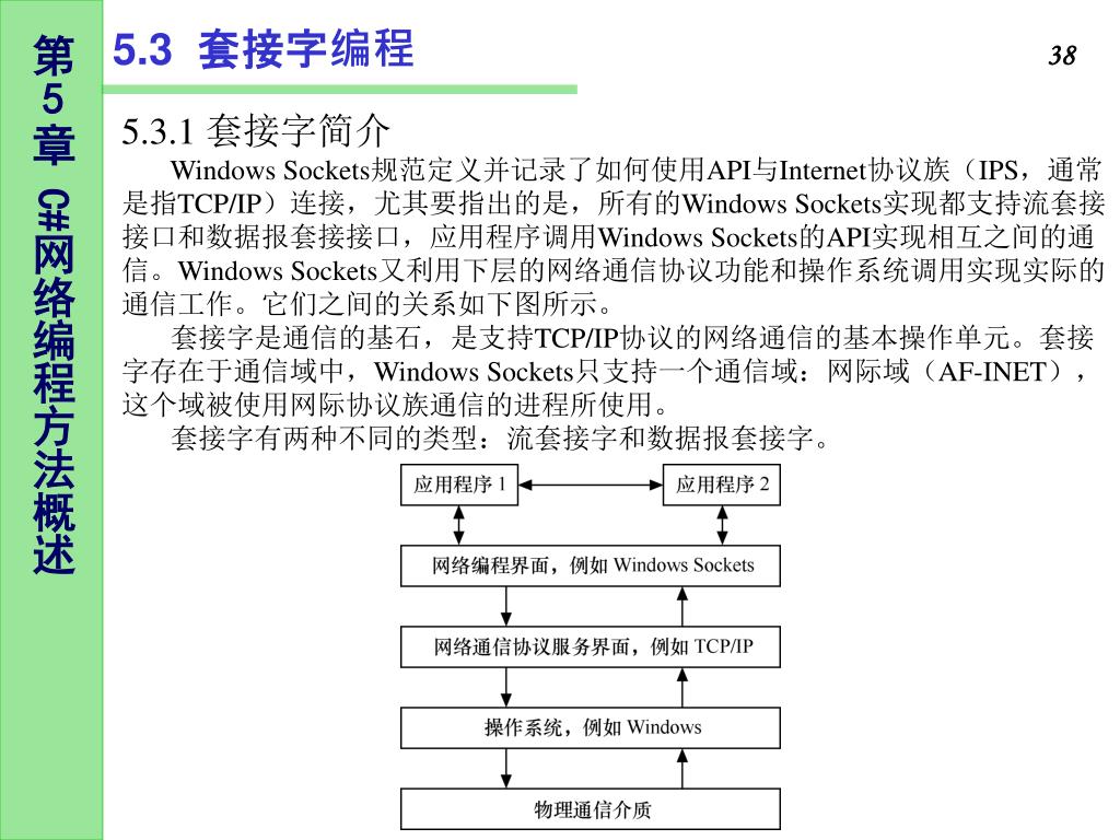 5.3 套接字编程 5.3.1 套接字简介 套接字(Socket)的概念首先是由BSD UNIX提出的。当时在UNIX编程中,引入了文件描述符(file descriptor)的概念。一个文件描述符提供了到一个文件对象的编程接口。因为UNIX操作系统中几乎所有的对象都定义成文件,文件描述符可以被用来在UNIX系统中收发数据,这些数据可以包含很多对象。因为不需要考虑所操作的文件(或设备)的类型,因此在UNIX中,用一个套接字表示一个网络文件描述符,编程就显得简便的多。在此基础上加利福尼亚大学Berkeley学院为UNIX开发了网络通信编程接口。但是最初它只能运行在UNIX操作系统,不支持DOS和Windows操作系统。随着Windows操作系统的日益推广,20世纪90年代初,微软和第三方厂商共同制定了一套标准,即Windows Sockets规范,简称WinSock。 Windows Sockets以UNIX中流行的Socket接口为范例定义了一套Microsoft Windows网络编程接口。Windows Sockets规范旨在提供给应用程序开发人员一套简单的API,并让各家网络软件供应商共同遵守。Windows Sockets 1.1和Berkeley Sockets都是基于TCP/IP协议的;Windows Sockets 2从Windows Sockets 1.1发展而来,与协议无关并向下兼容,可以使用任何底层传输协议提供的通信能力,来为上层应用程序完成网络数据通信,而不用关心底层网络链路通信的情况,真正实现了底层网络通信对应用程序的透明。