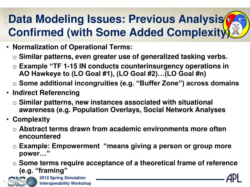 Data Modeling Issues: Previous Analysis Confirmed (with Some Added Complexity) • Normalization of Operational Terms: • Similar patterns, even greater use of generalized tasking verbs. • Example “TF 1-15 IN conducts counterinsurgency operations in AO Hawkeye to (LO Goal #1), (LO Goal #2)…(LO Goal #n) • Some additional incongruities (e.g. “Buffer Zone”) across domains • Indirect Referencing • Similar patterns, new instances associated with situational awareness (e.g. Population Overlays, Social Network Analyses • Complexity • Abstract terms drawn from academic environments more often encountered • Example: Empowerment “means giving a person or group more power…” • Some terms require acceptance of a theoretical frame of reference (e.g. “framing”
