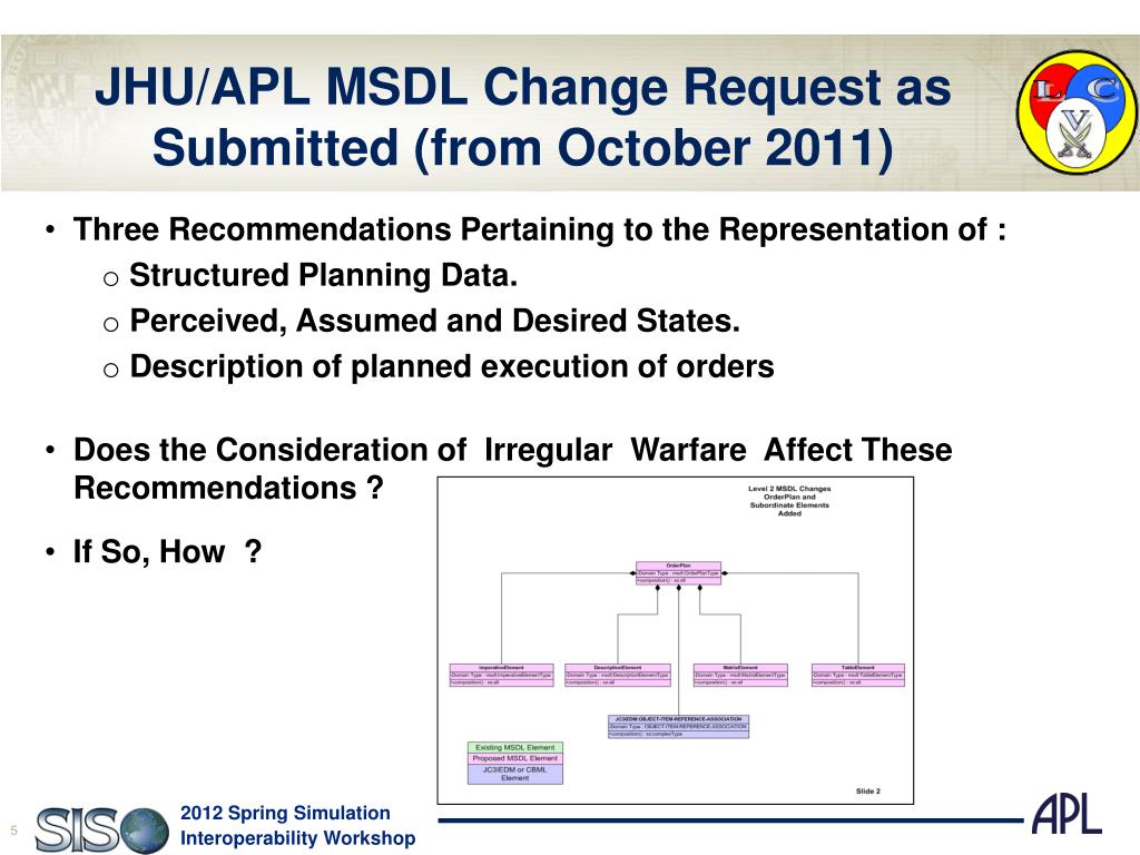 JHU/APL MSDL Change Request as Submitted (from October 2011) • Three Recommendations Pertaining to the Representation of : • Structured Planning Data. • Perceived, Assumed and Desired States. • Description of planned execution of orders • Does the Consideration of Irregular Warfare Affect These Recommendations ? • If So, How ?