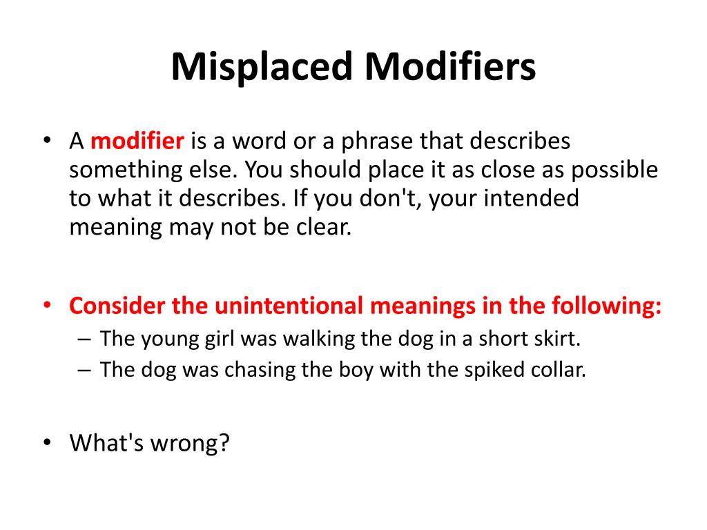 Misplaced Modifiers • A modifier is a word or a phrase that describes something else. You should place it as close as possible to what it describes. If you don't, your intended meaning may not be clear. • Consider the unintentional meanings in the following: • The young girl was walking the dog in a short skirt. • The dog was chasing the boy with the spiked collar. • What's wrong?