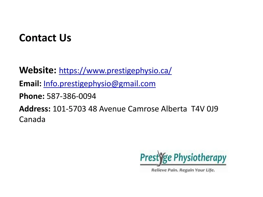 Contact Us Website: https://www.prestigephysio.ca/ Email: Info.prestigephysio@gmail.com Phone: 587-386-0094 Address: 101-5703 48 AvenueCamroseAlberta T4V 0J9 Canada