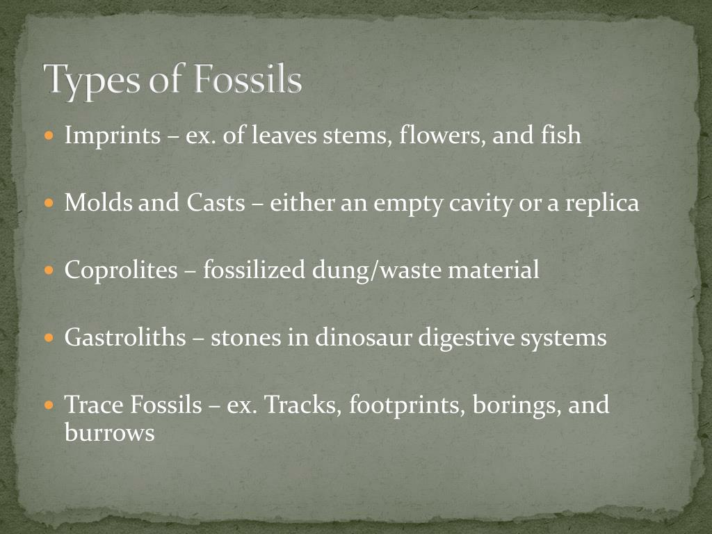 Types of Fossils • Imprints – ex. of leaves stems, flowers, and fish • Molds and Casts – either an empty cavity or a replica • Coprolites – fossilized dung/waste material • Gastroliths – stones in dinosaur digestive systems • Trace Fossils – ex. Tracks, footprints, borings, and burrows