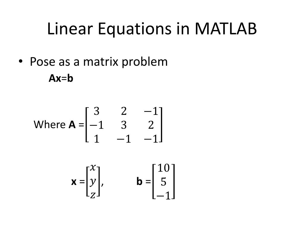 Linear Equations in MATLAB • For all three, first define matrices: A= [3 2 -1; -1 3 2; 1 -1 -1]; B= [10; 5; -1]; • Can be solved by any of the following syntaxes: X=inv(A)*B X=A^-1*B X=A\BNOTX=A/B or X=B\A • Each gives equivalent answer • Left division is more computationally efficient: less time to compute for large matrices