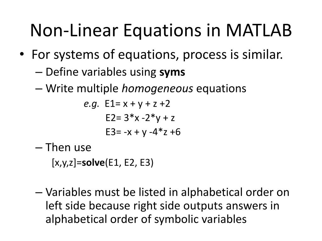 Non-Linear Equations in MATLAB • For systems of equations, process is similar. • Define variables using syms • Write multiple homogeneous equations e.g. E1= x + y + z +2 E2= 3*x -2*y + z E3= -x + y -4*z +6 • Then use [x,y,z]=solve(E1, E2, E3) • Variables must be listed in alphabetical order on left side because right side outputs answers in alphabetical order of symbolic variables