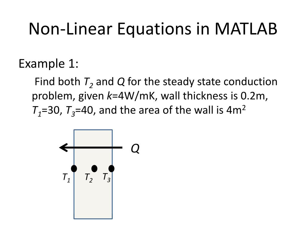 Non-Linear Equations in MATLAB Example 1: Find both T2 and Q for the steady state conduction problem, given k=4W/mK, wall thickness is 0.2m, T1=30, T3=40, and the area of the wall is 4m2 Q T3 T1 T2