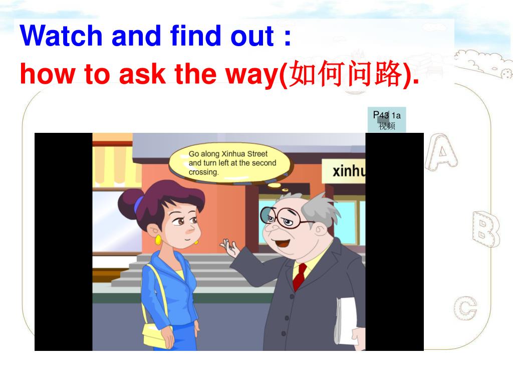 Watch and find out : how to ask the way(如何问路). P43 1a 视频
