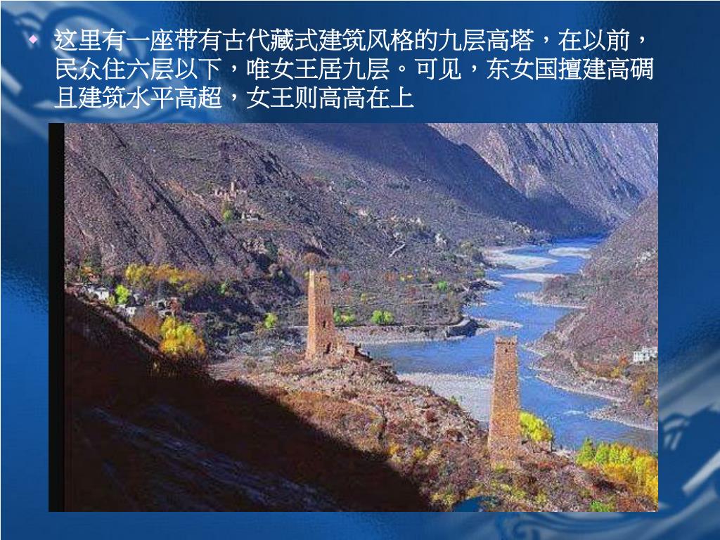 这里有一座带有古代藏式建筑风格的九层高塔,在以前,民众住六层以下,唯女王居九层。可见,东女国擅建高碉且建筑水平高超,女王则高高在上这里有一座带有古代藏式建筑风格的九层高塔,在以前,民众住六层以下,唯女王居九层。可见,东女国擅建高碉且建筑水平高超,女王则高高在上