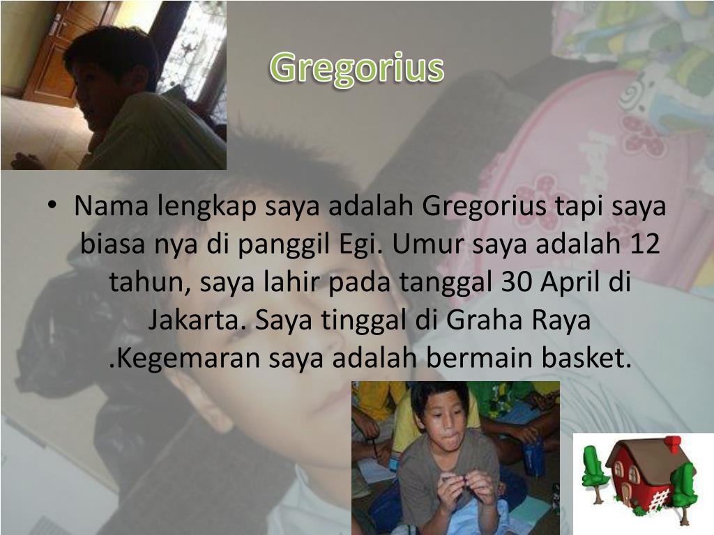 Gregorius • NamalengkapsayaadalahGregoriustapisayabiasanyadipanggilEgi. Umursayaadalah 12 tahun, sayalahirpadatanggal 30 April di Jakarta. SayatinggaldiGraha Raya .Kegemaransayaadalahbermain basket.