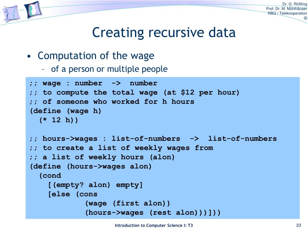 Creating recursive data • Computation of the wage • of a person or multiple people ;; wage : number -> number ;; to compute the total wage (at $12 per hour) ;; of someone who worked for h hours (define (wage h) (* 12 h)) ;; hours->wages : list-of-numbers -> list-of-numbers ;; to create a list of weekly wages from ;; a list of weekly hours (alon) (define (hours->wages alon) (cond [(empty? alon) empty] [else (cons (wage (first alon)) (hours->wages (rest alon)))]))