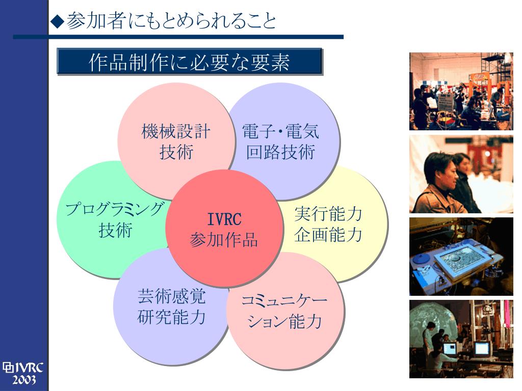 ◆参加者にもとめられること 作品制作に必要な要素 機械設計 技術 電子・電気 回路技術 プログラミング 技術 実行能力 企画能力 IVRC 参加作品 芸術感覚 研究能力 コミュニケー ション能力