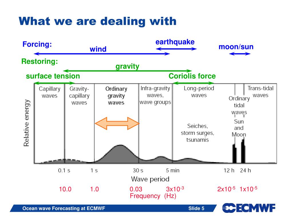 earthquake Forcing: moon/sun wind Restoring: gravity surface tension Coriolis force 10.0 1.0 0.03 3x10-3 2x10-5 1x10-5 Frequency (Hz) What we are dealing with Ocean wave Forecasting at ECMWF