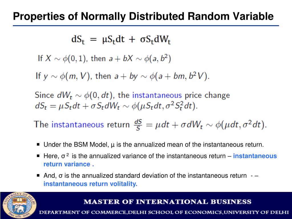 Properties of Normally Distributed Random Variable • Under the BSM Model, µ is the annualized mean of the instantaneous return. • Here, σ 2 is the annualized variance of the instantaneous return – instantaneous return variance . • And, σ is the annualized standard deviation of the instantaneous return - – instantaneous return volitality.