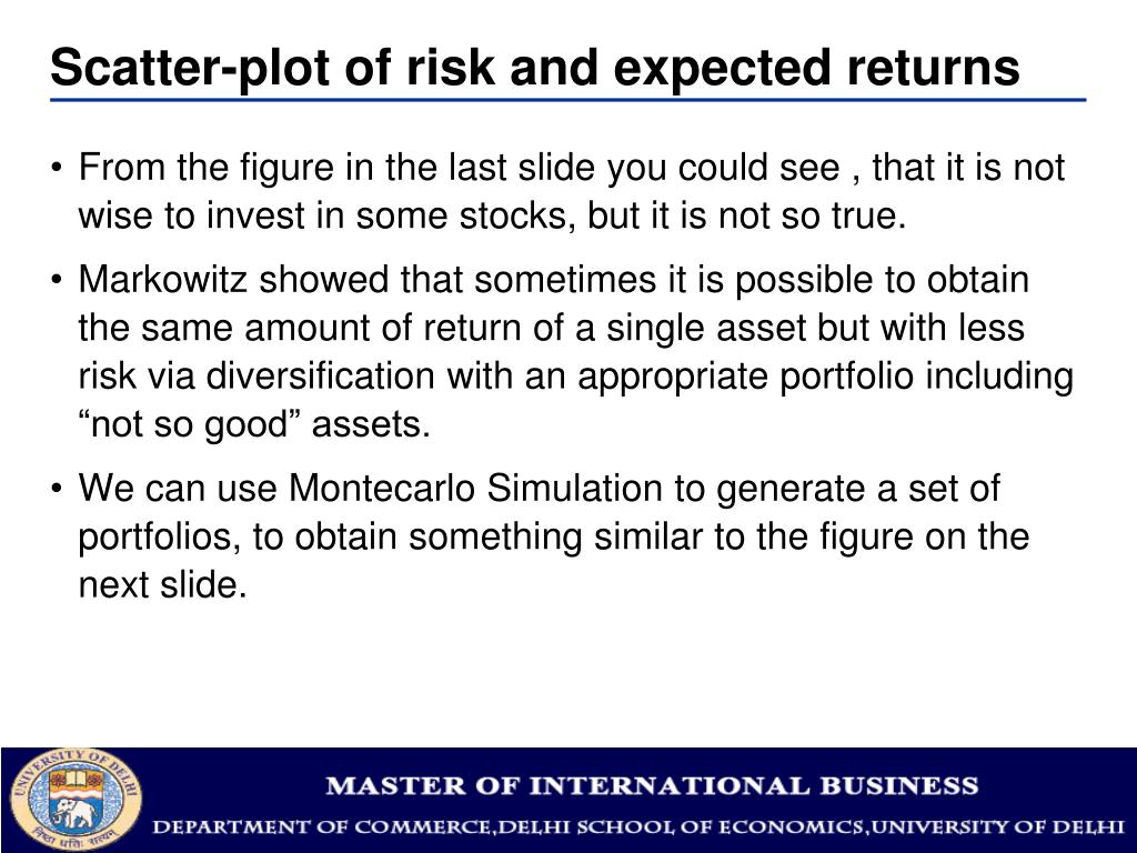 Scatter-plot of risk and expected returns • From the figure in the last slide you could see , that it is not wise to invest in some stocks, but it is not so true. • Markowitz showed that sometimes it is possible to obtain the same amount of return of a single asset but with less risk via diversification with an appropriate portfolio including “not so good” assets. • We can use Montecarlo Simulation to generate a set of portfolios, to obtain something similar to the figure on the next slide.