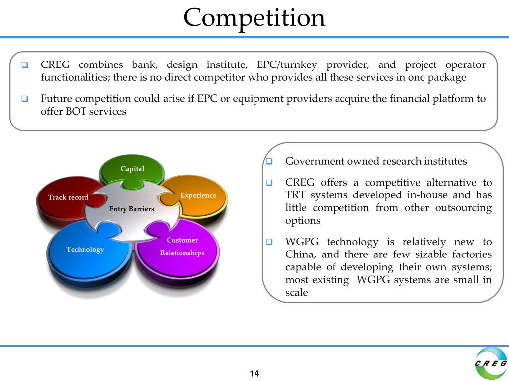 Capital Experience Track record Entry Barriers Customer Relationships Technology Competition • CREG combines bank, design institute, EPC/turnkey provider, and project operator functionalities; there is no direct competitor who provides all these services in one package • Future competition could arise if EPC or equipment providers acquire the financial platform to offer BOT services • Government owned research institutes • CREG offers a competitive alternative to TRT systems developed in-house and has little competition from other outsourcing options • WGPG technology is relatively new to China, and there are few sizable factories capable of developing their own systems; most existing WGPG systems are small in scale