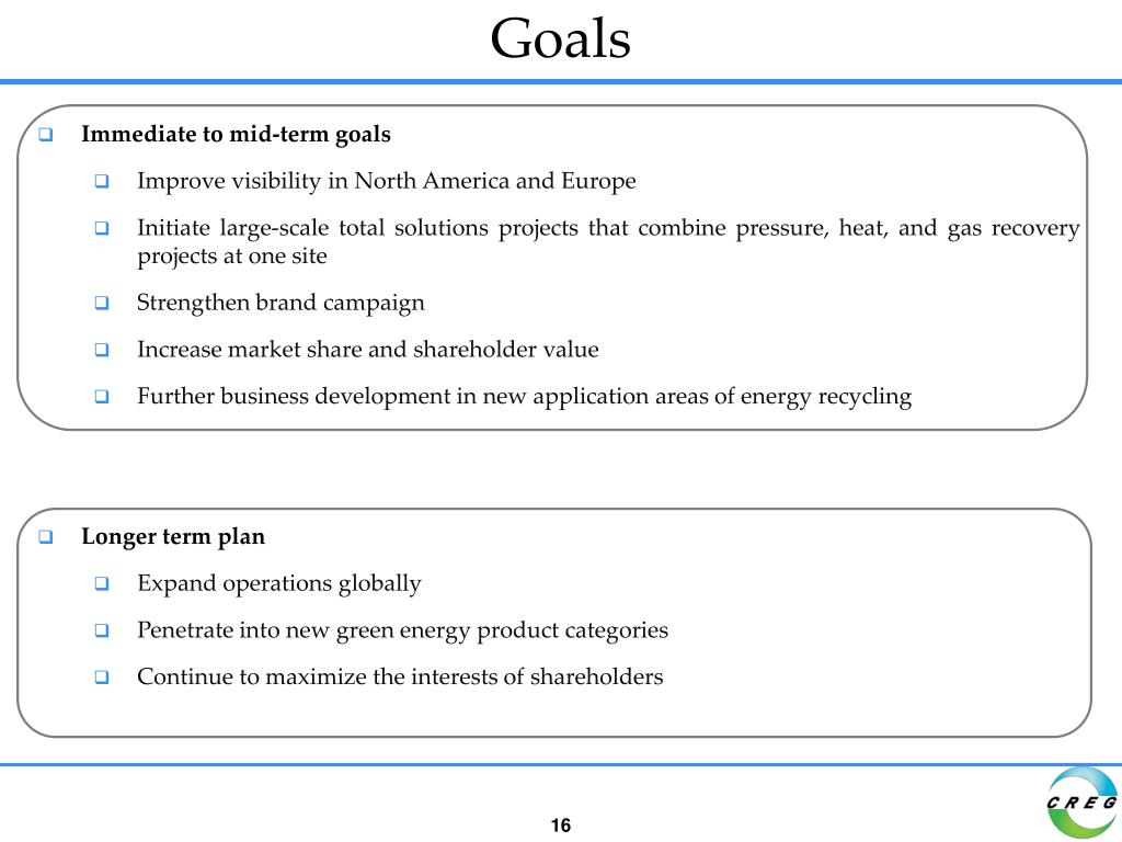 Goals • Immediate to mid-term goals • Improve visibility in North America and Europe • Initiate large-scale total solutions projects that combine pressure, heat, and gas recovery projects at one site • Strengthen brand campaign • Increase market share and shareholder value • Further business development in new application areas of energy recycling • Longer term plan • Expand operations globally • Penetrate into new green energy product categories • Continue to maximize the interests of shareholders