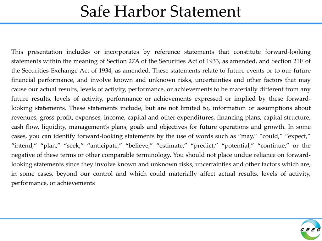 Safe Harbor Statement This presentation includes or incorporates by reference statements that constitute forward-looking statements within the meaning of Section 27A of the Securities Act of 1933, as amended, and Section 21E of the Securities Exchange Act of 1934, as amended. These statements relate to future events or to our future financial performance, and involve known and unknown risks, uncertainties and other factors that may cause our actual results, levels of activity, performance, or achievements to be materially different from any future results, levels of activity, performance or achievements expressed or implied by these forward-looking statements. These statements include, but are not limited to, information or assumptions about revenues, gross profit, expenses, income, capital and other expenditures, financing plans, capital structure, cash flow, liquidity, management’s plans, goals and objectives for future operations and growth. In some cases, you can identify forward-looking statements by the use of words such as “may,” “could,” “expect,” “intend,” “plan,” “seek,” “anticipate,” “believe,” “estimate,” “predict,” “potential,” “continue,” or the negative of these terms or other comparable terminology. You should not place undue reliance on forward-looking statements since they involve known and unknown risks, uncertainties and other factors which are, in some cases, beyond our control and which could materially affect actual results, levels of activity, performance, or achievements
