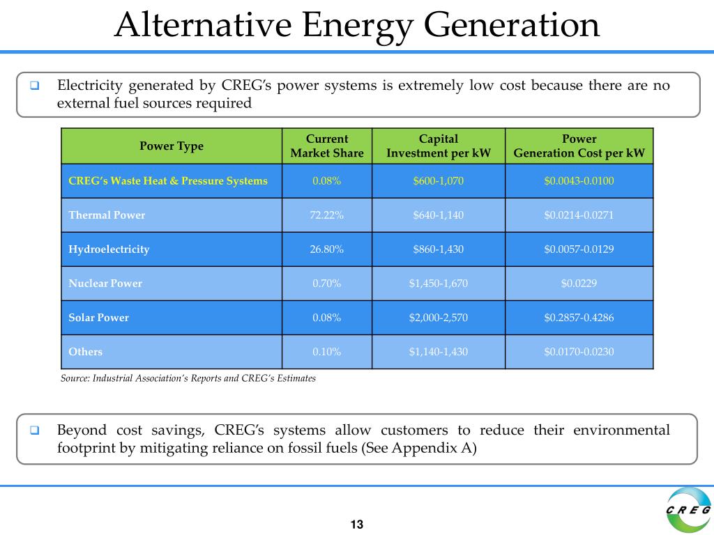 Alternative Energy Generation • Electricity generated by CREG’s power systems is extremely low cost because there are no external fuel sources required • Beyond cost savings, CREG’s systems allow customers to reduce their environmental footprint by mitigating reliance on fossil fuels (See Appendix A) Source: Industrial Association’s Reports and CREG’s Estimates