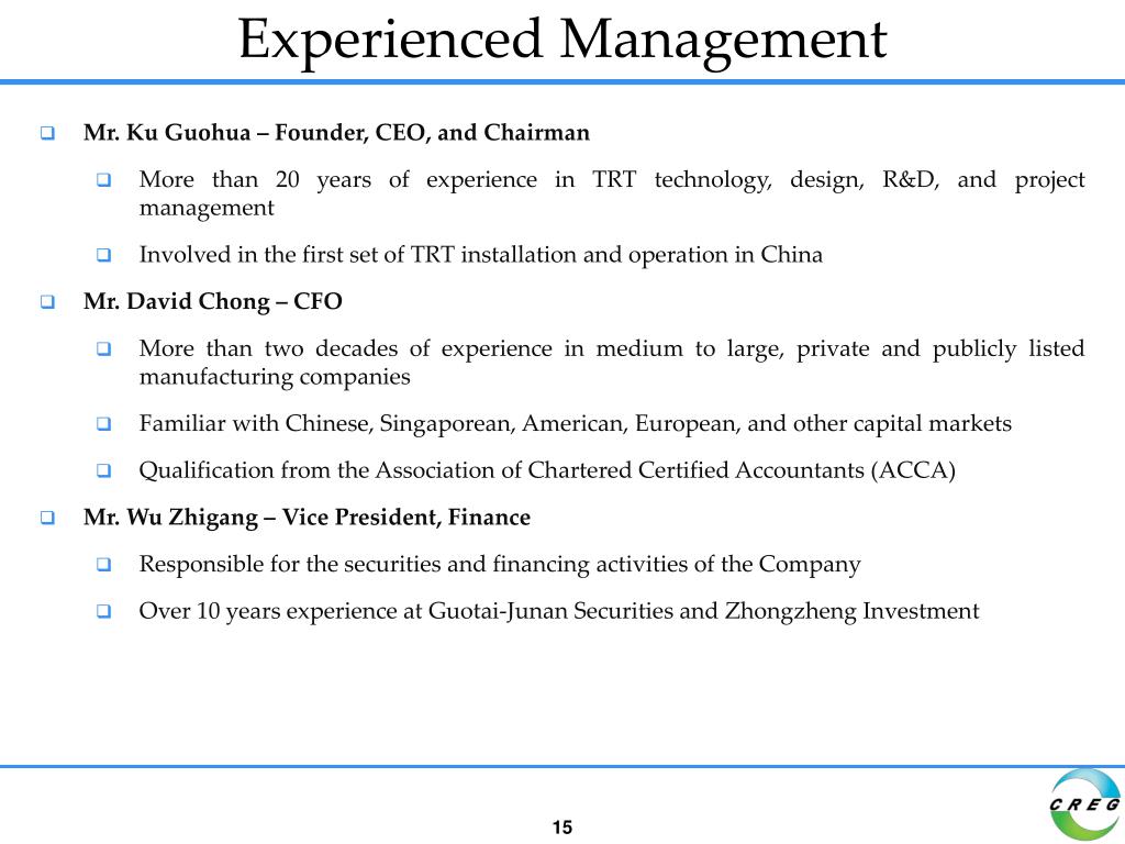 Experienced Management • Mr. Ku Guohua – Founder, CEO, and Chairman • More than 20 years of experience in TRT technology, design, R&D, and project management • Involved in the first set of TRT installation and operation in China • Mr. David Chong – CFO • More than two decades of experience in medium to large, private and publicly listed manufacturing companies • Familiar with Chinese, Singaporean, American, European, and other capital markets • Qualification from the Association of Chartered Certified Accountants (ACCA) • Mr. Wu Zhigang – Vice President, Finance • Responsible for the securities and financing activities of the Company • Over 10 years experience at Guotai-Junan Securities and Zhongzheng Investment