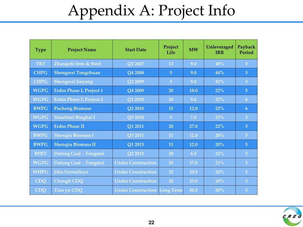 Business Growth • Current CREG projects (See Appendix A) • 14 systems in operation: 3 TRT/BPRT project, 2 CHPG projects, 6Heat Recovery/WGPG projects and 3 BWPG project are in operation (total capacity of 130 MW) • 2 heat recovery/WGPG & 3 CDQ projects are under construction (total capacity 102.5 MW) • MOU’s for six other TRT, CHPG, and WGPG projects (total capacity 279 MW) • Relationships with Chinese industrial giants • Sino-Steel Group - China’s largest nickel steel plant • Erdos Metallurgy Co. - the world’s largest ferrosilicon alloy plant • Shengwei Cement Group - major Chinese cement producer • Chengli & Tianyu Coke Dry Quenching (CDQ) – major coking plants