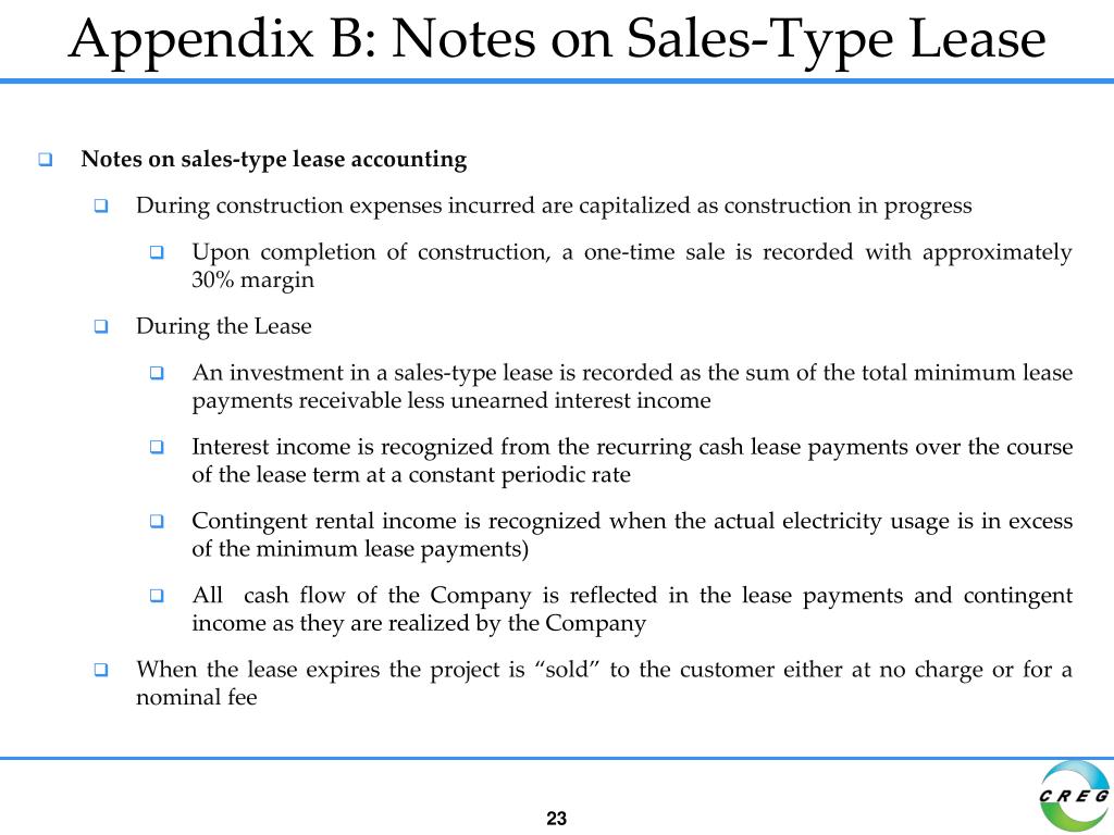 Appendix B: Notes on Sales-Type Lease • Notes on sales-type lease accounting • During construction expenses incurred are capitalized as construction in progress • Upon completion of construction, a one-time sale is recorded with approximately 30% margin • During the Lease • An investment in a sales-type lease is recorded as the sum of the total minimum lease payments receivable less unearned interest income • Interest income is recognized from the recurring cash lease payments over the course of the lease term at a constant periodic rate • Contingent rental income is recognized when the actual electricity usage is in excess of the minimum lease payments) • All cash flow of the Company is reflected in the lease payments and contingent income as they are realized by the Company • When the lease expires the project is “sold” to the customer either at no charge or for a nominal fee