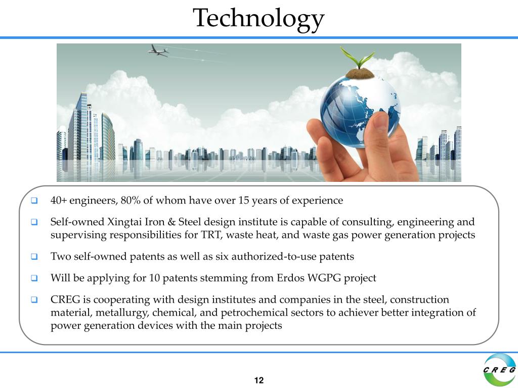 Technology • 40+ engineers, 80% of whom have over 15 years of experience • Self-owned Xingtai Iron & Steel design institute is capable of consulting, engineering and supervising responsibilities for TRT, waste heat, and waste gas power generation projects • Two self-owned patents as well as six authorized-to-use patents • Will be applying for 10 patents stemming from Erdos WGPG project • CREG is cooperating with design institutes and companies in the steel, construction material, metallurgy, chemical, and petrochemical sectors to achiever better integration of power generation devices with the main projects