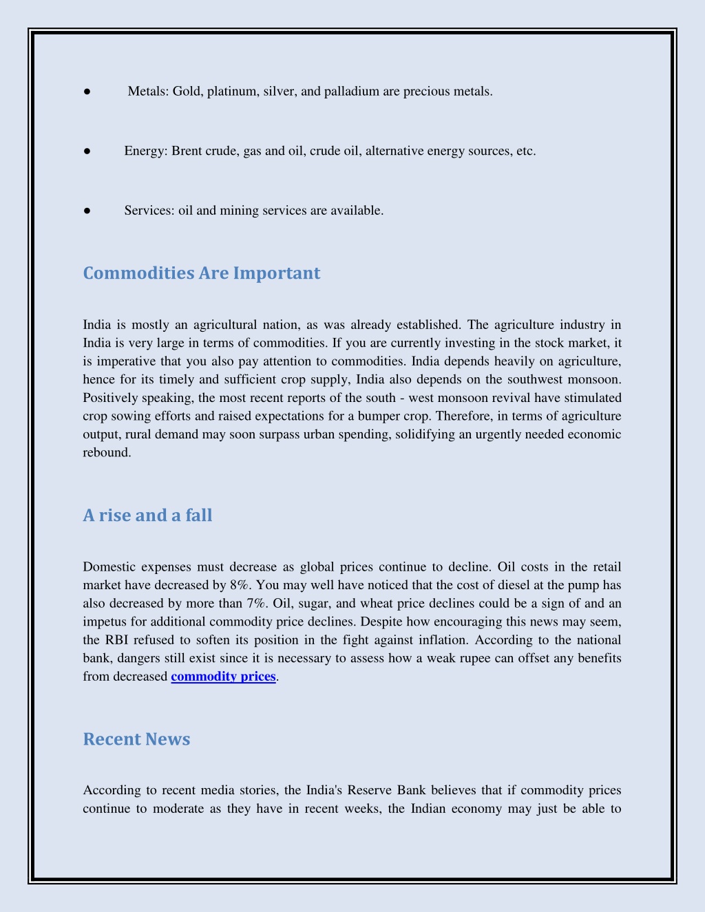 ● Metals: Gold, platinum, silver, and palladium are precious metals. ● Energy: Brent crude, gas and oil, crude oil, alternative energy sources, etc. ● Services: oil and mining services are available. Commodities Are Important India is mostly an agricultural nation, as was already established. The agriculture industry in India is very large in terms of commodities. If you are currently investing in the stock market, it is imperative that you also pay attention to commodities. India depends heavily on agriculture, hence for its timely and sufficient crop supply, India also depends on the southwest monsoon. Positively speaking, the most recent reports of the south - west monsoon revival have stimulated crop sowing efforts and raised expectations for a bumper crop. Therefore, in terms of agriculture output, rural demand may soon surpass urban spending, solidifying an urgently needed economic rebound. A rise and a fall Domestic expenses must decrease as global prices continue to decline. Oil costs in the retail market have decreased by 8%. You may well have noticed that the cost of diesel at the pump has also decreased by more than 7%. Oil, sugar, and wheat price declines could be a sign of and an impetus for additional commodity pricedeclines. Despite how encouraging this news may seem, the RBI refused to soften its position in the fight against inflation. According to the national bank, dangers still exist since it is necessary to assess how a weak rupee can offset any benefits from decreased commodity prices. Recent News According to recent media stories, the India's Reserve Bank believes that if commodity prices continue to moderate as they have in recent weeks, the Indian economy may just be able to