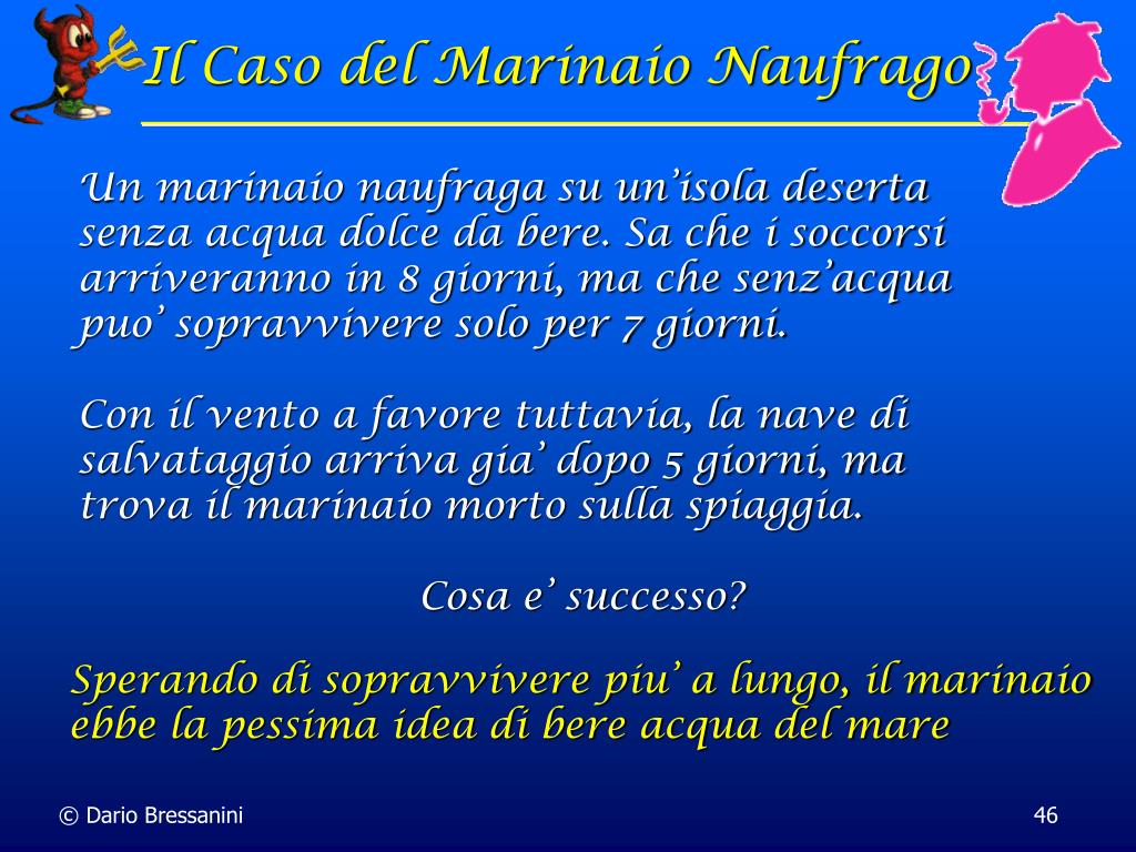 Il Caso del Marinaio Naufrago Un marinaio naufraga su un’isola deserta senza acqua dolce da bere. Sa che i soccorsi arriveranno in 8 giorni, ma che senz’acqua puo’ sopravvivere solo per 7 giorni. Con il vento a favore tuttavia, la nave di salvataggio arriva gia’ dopo 5 giorni, ma trova il marinaio morto sulla spiaggia. Cosa e’ successo? Sperando di sopravvivere piu’ a lungo, il marinaio ebbe la pessima idea di bere acqua del mare © Dario Bressanini