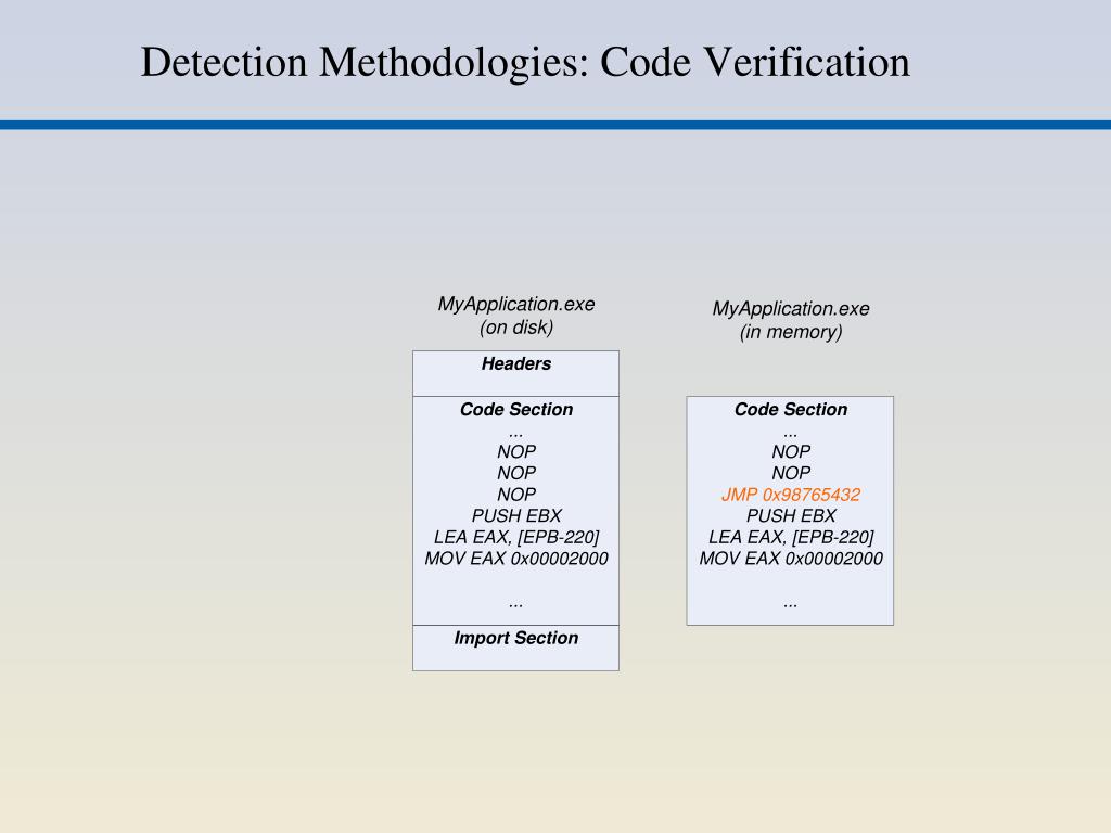 Detection Methodologies • Code verification • Code sections are read only in all modern OSes • Programs should not modify their own code • Check to see if the files on disk match what is running in memory