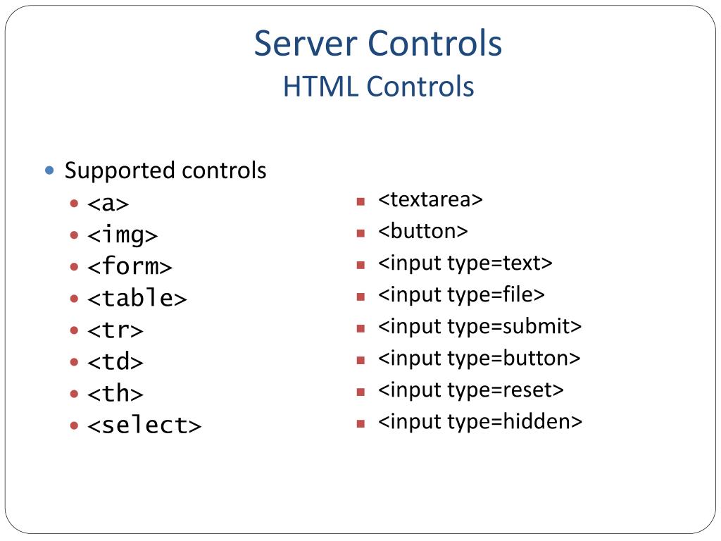 Server ControlsHTML Controls • Supported controls • <a> • <img> • <form> • <table> • <tr> • <td> • <th> • <select> • <textarea> • <button> • <input type=text> • <input type=file> • <input type=submit> • <input type=button> • <input type=reset> • <input type=hidden>