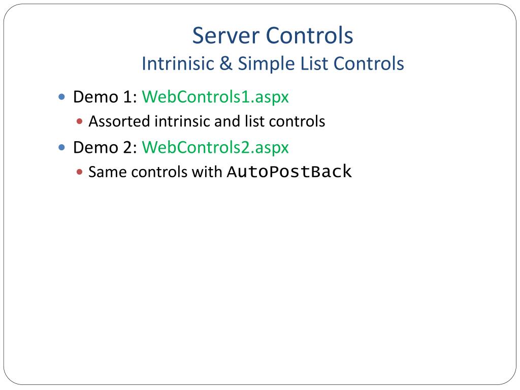 Server Controls Intrinisic & Simple List Controls • Demo 1: WebControls1.aspx • Assorted intrinsic and list controls • Demo 2: WebControls2.aspx • Same controls with AutoPostBack