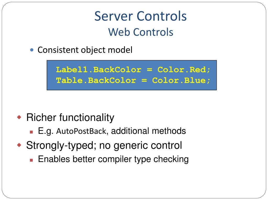 Server ControlsWeb Controls • Consistent object model • Label1.BackColor = Color.Red; • Table.BackColor = Color.Blue; • Richer functionality • E.g. AutoPostBack, additional methods • Strongly-typed; no generic control • Enables better compiler type checking