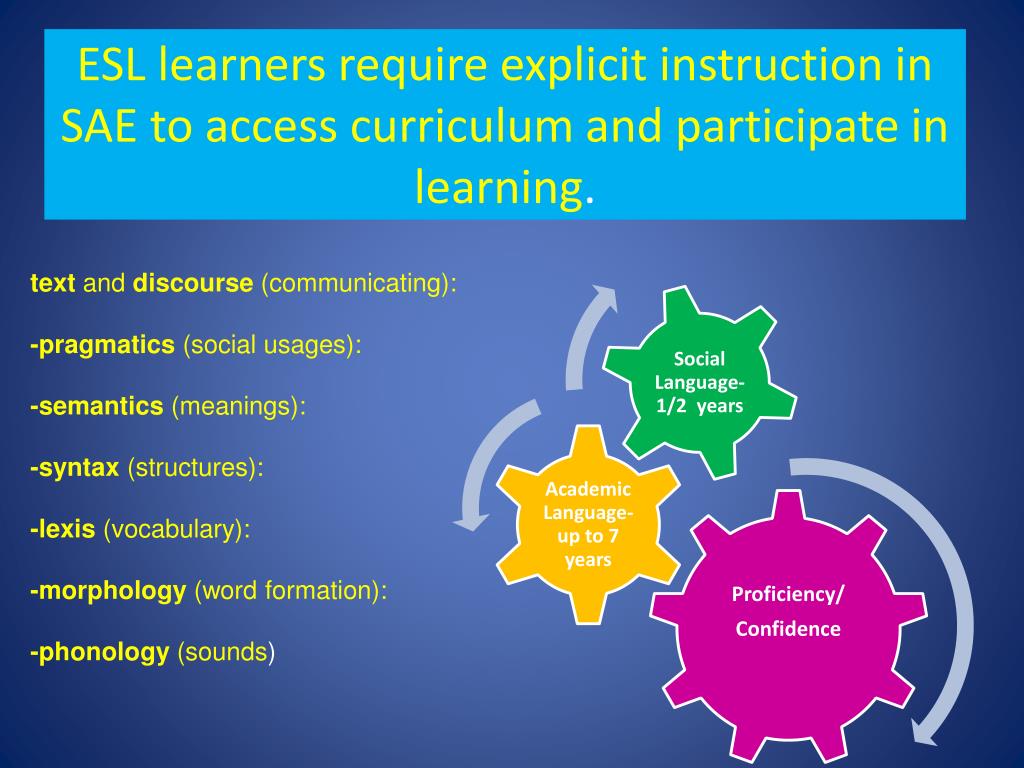 ESL learners require explicit instruction in SAE to access curriculum and participate in learning. • text and discourse (communicating): • -pragmatics (social usages): • -semantics (meanings): • -syntax (structures): • -lexis (vocabulary): • -morphology (word formation): • -phonology (sounds)