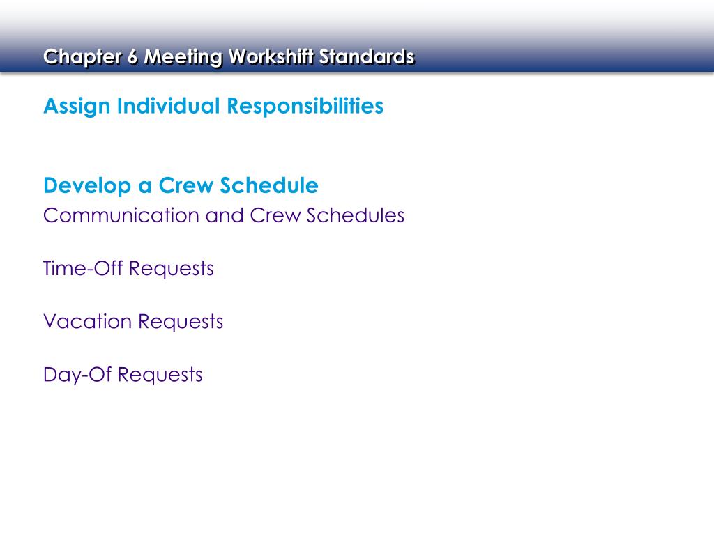 Assign Individual Responsibilities Develop a Crew Schedule Communication and Crew Schedules Time-Off Requests Vacation Requests Day-Of Requests