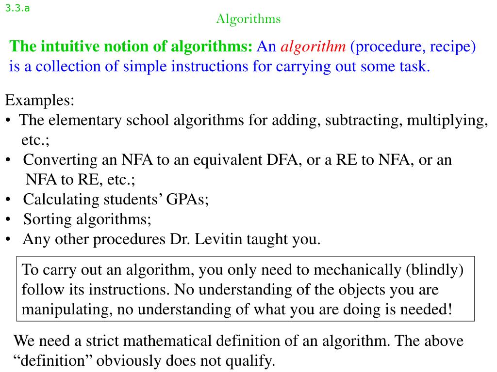3.3.a The intuitive notion of algorithms: An algorithm (procedure, recipe) is a collection of simple instructions for carrying out some task. Algorithms • Examples: • The elementary school algorithms for adding, subtracting, multiplying, • etc.; • Converting an NFA to an equivalent DFA, or a RE to NFA, or an • NFA to RE, etc.; • Calculating students’ GPAs; • Sorting algorithms; • Any other procedures Dr. Levitin taught you. To carry out an algorithm, you only need to mechanically (blindly) follow its instructions. No understanding of the objects you are manipulating, no understanding of what you are doing is needed! We need a strict mathematical definition of an algorithm. The above “definition” obviously does not qualify.