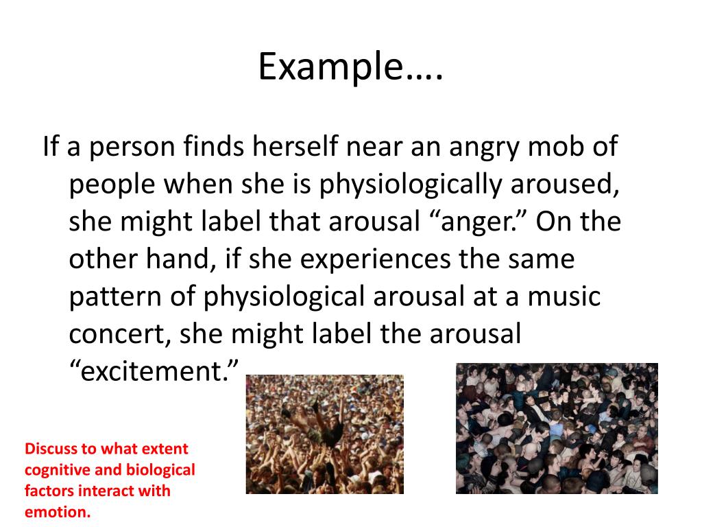 Example…. If a person finds herself near an angry mob of people when she is physiologically aroused, she might label that arousal “anger.” On the other hand, if she experiences the same pattern of physiological arousal at a music concert, she might label the arousal “excitement.” Discuss to what extent cognitive and biological factors interact with emotion.