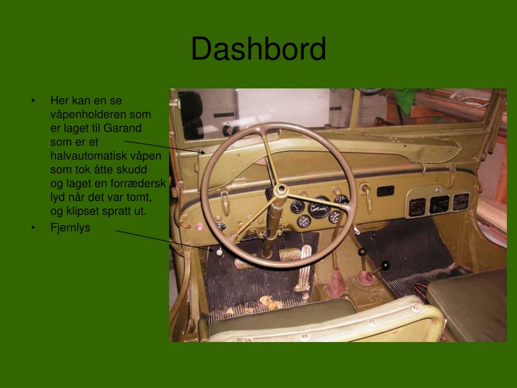 Dashbord • Her kan en se våpenholderen som er laget til Garand som er et halvautomatisk våpen som tok åtte skudd og laget en forrædersk lyd når det var tomt, og klipset spratt ut. • Fjernlys