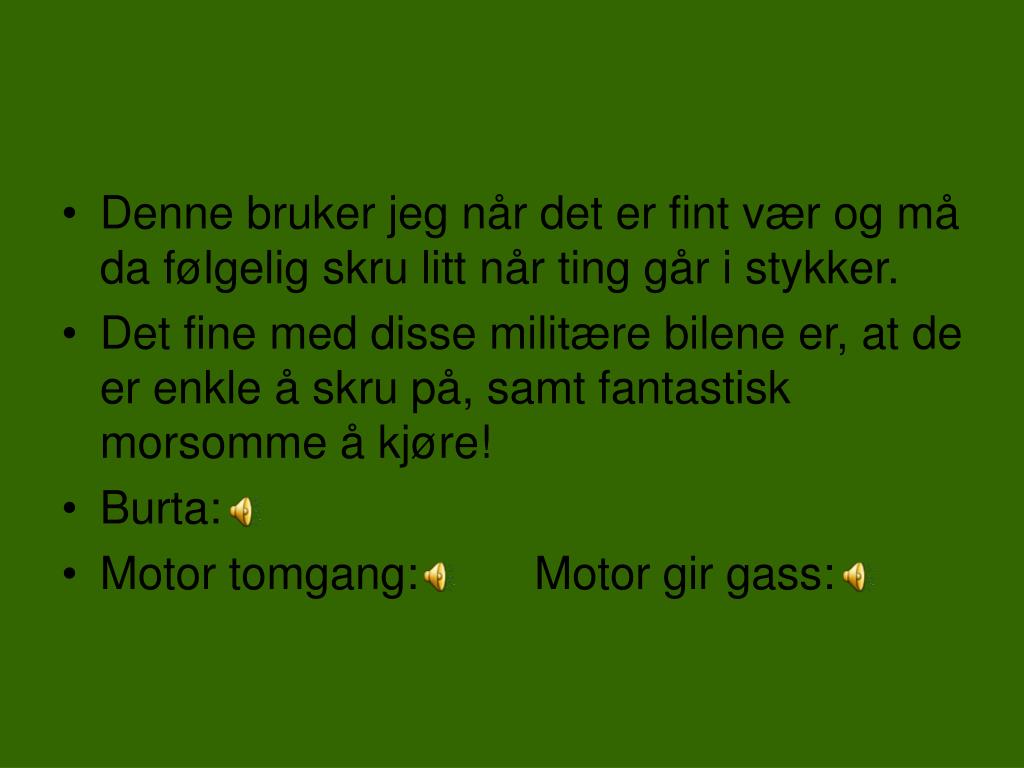 Denne bruker jeg når det er fint vær og må da følgelig skru litt når ting går i stykker. • Det fine med disse militære bilene er, at de er enkle å skru på, samt fantastisk morsomme å kjøre! • Burta: • Motor tomgang: Motor gir gass:
