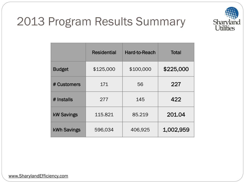 2013 Program Challenges • Customer Verification Process • Customers must be verified before implementation • Customer look up feature based on: • ESI ID Number – Mission area • Meter Number – Other areas • Input errors with Meter/account numbers • Marketing • Residents remain uncertain about our efficiency programs • Customers needing service in underserved Sharyland territories • Project Sponsors Missed Milestones (open pot)