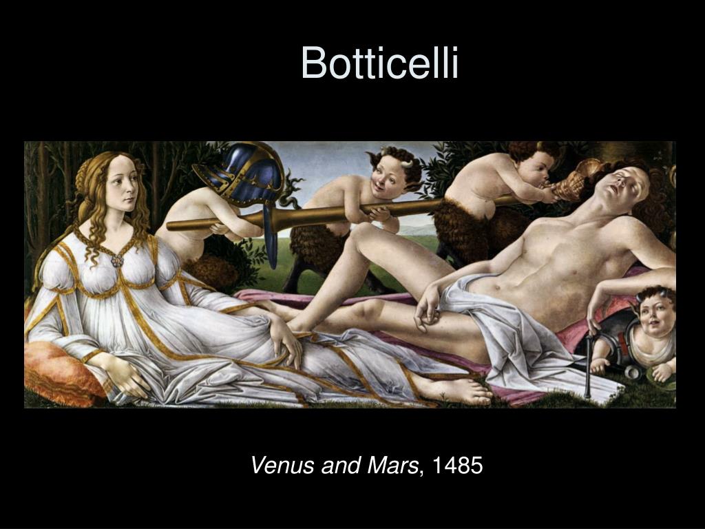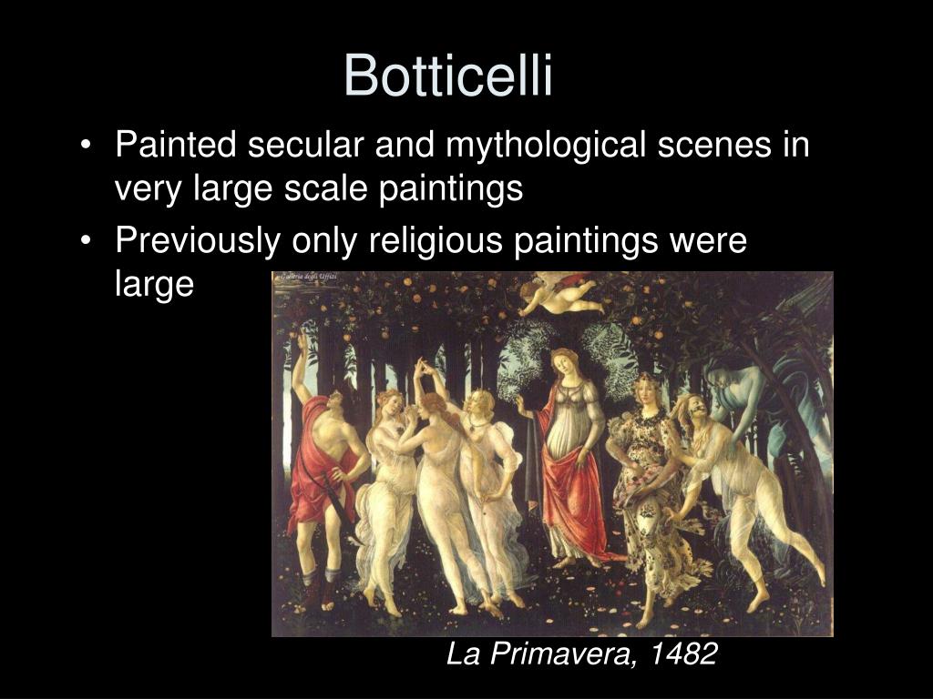 Botticelli • Painted secular and mythological scenes in very large scale paintings • Previously only religious paintings were large La Primavera, 1482