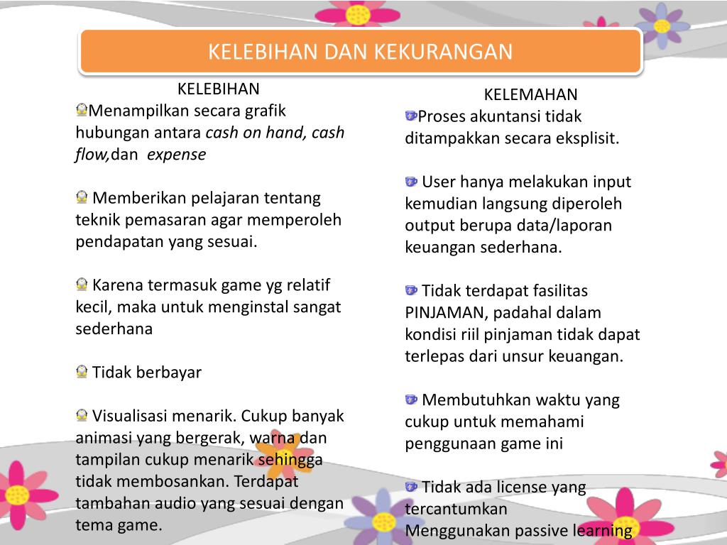 KELEBIHAN DAN KEKURANGAN • KELEBIHAN • Menampilkan secara grafik hubungan antara cash on hand, cash flow,dan expense • Memberikan pelajaran tentang teknik pemasaran agar memperoleh pendapatan yang sesuai. • Karena termasuk game yg relatif kecil, maka untuk menginstal sangat sederhana • Tidak berbayar • Visualisasi menarik. Cukup banyak animasi yang bergerak, warna dan tampilan cukup menarik sehingga tidak membosankan. Terdapat tambahan audio yang sesuai dengan tema game. • KELEMAHAN • Proses akuntansi tidak ditampakkan secara eksplisit. • User hanya melakukan input kemudian langsung diperoleh output berupa data/laporan keuangan sederhana. • Tidak terdapat fasilitas PINJAMAN, padahal dalam kondisi riil pinjaman tidak dapat terlepas dari unsur keuangan. • Membutuhkan waktu yang cukup untuk memahami penggunaan game ini • Tidak ada license yang tercantumkan • Menggunakan passive learning