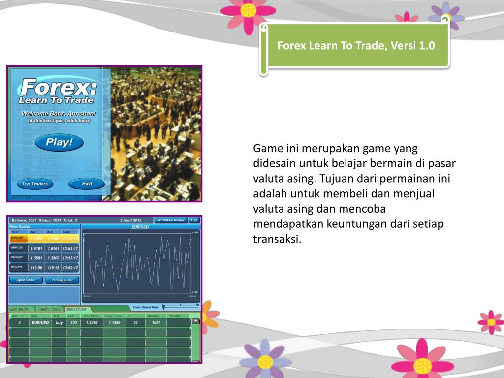 Forex Learn To Trade, Versi 1.0 Game ini merupakan game yang didesain untuk belajar bermain di pasar valuta asing. Tujuan dari permainan ini adalah untuk membeli dan menjual valuta asing dan mencoba mendapatkan keuntungan dari setiap transaksi.