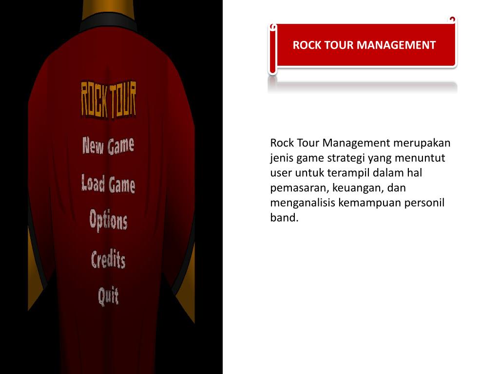ROCK TOUR MANAGEMENT Rock Tour Management merupakanjenis game strategi yang menuntut user untukterampildalamhalpemasaran, keuangan, danmenganalisiskemampuanpersonil band.