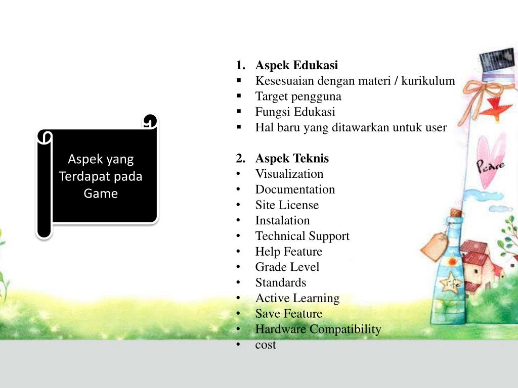 Aspek Edukasi • Kesesuaian dengan materi / kurikulum • Target pengguna • Fungsi Edukasi • Hal baru yang ditawarkan untuk user • Aspek Teknis • Visualization • Documentation • Site License • Instalation • Technical Support • Help Feature • Grade Level • Standards • Active Learning • Save Feature • Hardware Compatibility • cost Aspek yang Terdapatpada Game
