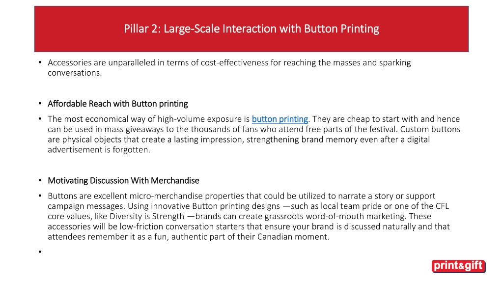 5. Pillar 2: Large-Scale Interaction with Button Printing • Accessories are unparalleled in terms of cost-effectiveness for reaching the masses and sparking conversations. • Affordable Reach with Button printing • The most economical way of high-volume exposure is button printing. They are cheap to start with and hence can be used in mass giveaways to the thousands of fans who attend free parts of the festival. Custom buttons are physical objects that create a lasting impression, strengthening brand memory even after a digital advertisement is forgotten. • Motivating Discussion With Merchandise • Buttons are excellent micro-merchandise properties that could be utilized to narrate a story or support campaign messages. Using innovative Button printing designs —such as local team pride or one of the CFL core values, like Diversity is Strength —brands can create grassroots word-of-mouth marketing. These accessories will be low-friction conversation starters that ensure your brand is discussed naturally and that attendees remember it as a fun, authentic part of their Canadian moment.