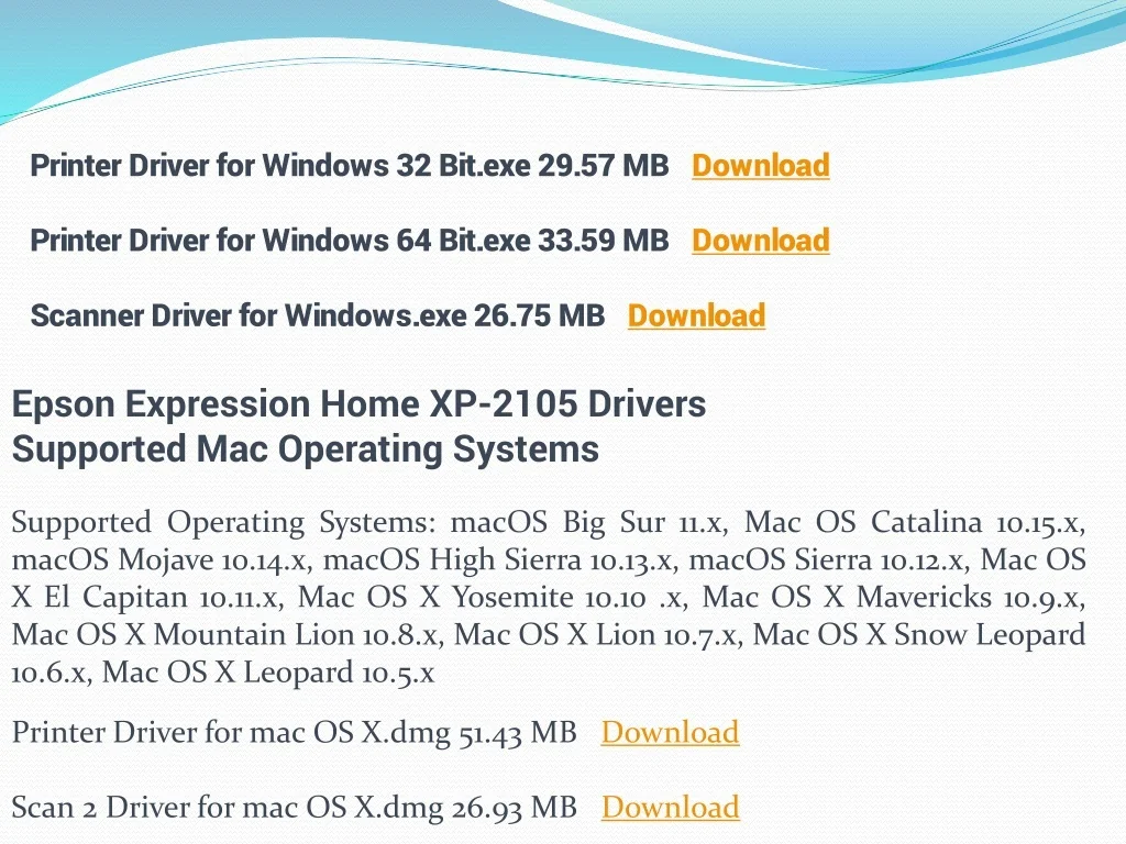 Printer Driver for Windows 32 Bit.exe 29.57 MB Download Printer Driver for Windows 64 Bit.exe 33.59 MB Download Scanner Driver for Windows.exe 26.75 MB Download Epson Expression Home XP-2105 Drivers Supported Mac Operating Systems Supported Operating Systems: macOS Big Sur 11.x, Mac OS Catalina 10.15.x, macOS Mojave 10.14.x, macOS High Sierra 10.13.x, macOS Sierra 10.12.x, Mac OS X El Capitan 10.11.x, Mac OS X Yosemite 10.10 .x, Mac OS X Mavericks 10.9.x, Mac OS X Mountain Lion 10.8.x, Mac OS X Lion 10.7.x, Mac OS X Snow Leopard 10.6.x, Mac OS X Leopard 10.5.x Printer Driver for mac OS X.dmg 51.43 MB Download Scan 2 Driver for mac OS X.dmg 26.93 MB Download