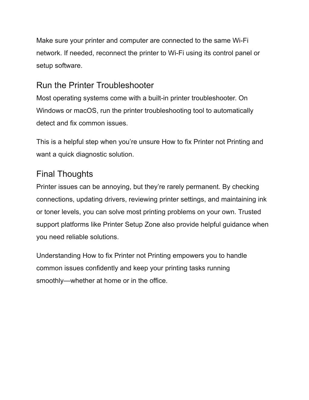 Make sure your printer and computer are connected to the same Wi-Fi network. If needed, reconnect the printer to Wi-Fi using its control panel or setup software. Run the Printer Troubleshooter Most operating systems come with a built-in printer troubleshooter. On Windows or macOS, run the printer troubleshooting tool to automatically detect and fix common issues. This is a helpful step when you’re unsure How to fix Printer not Printing and want a quick diagnostic solution. Final Thoughts Printer issues can be annoying, but they’re rarely permanent. By checking connections, updating drivers, reviewing printer settings, and maintaining ink or toner levels, you can solve most printing problems on your own. Trusted support platforms like Printer Setup Zone also provide helpful guidance when you need reliable solutions. Understanding How to fix Printer not Printing empowers you to handle common issues confidently and keep your printing tasks running smoothly—whether at home or in the office.